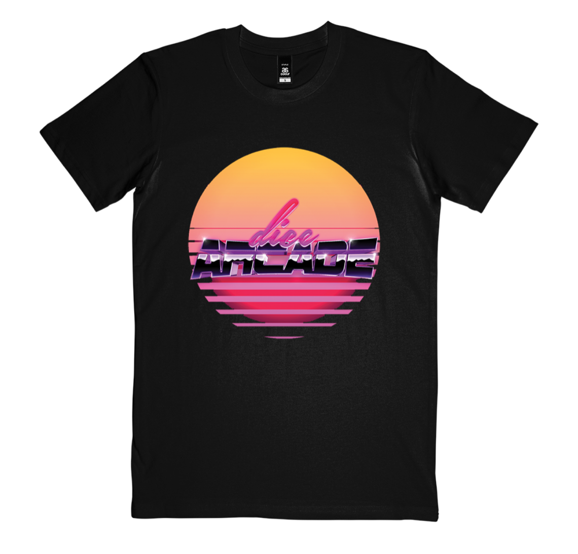 Black AS Colour T Shirt with Dice Arcade sunset logo.