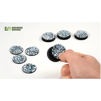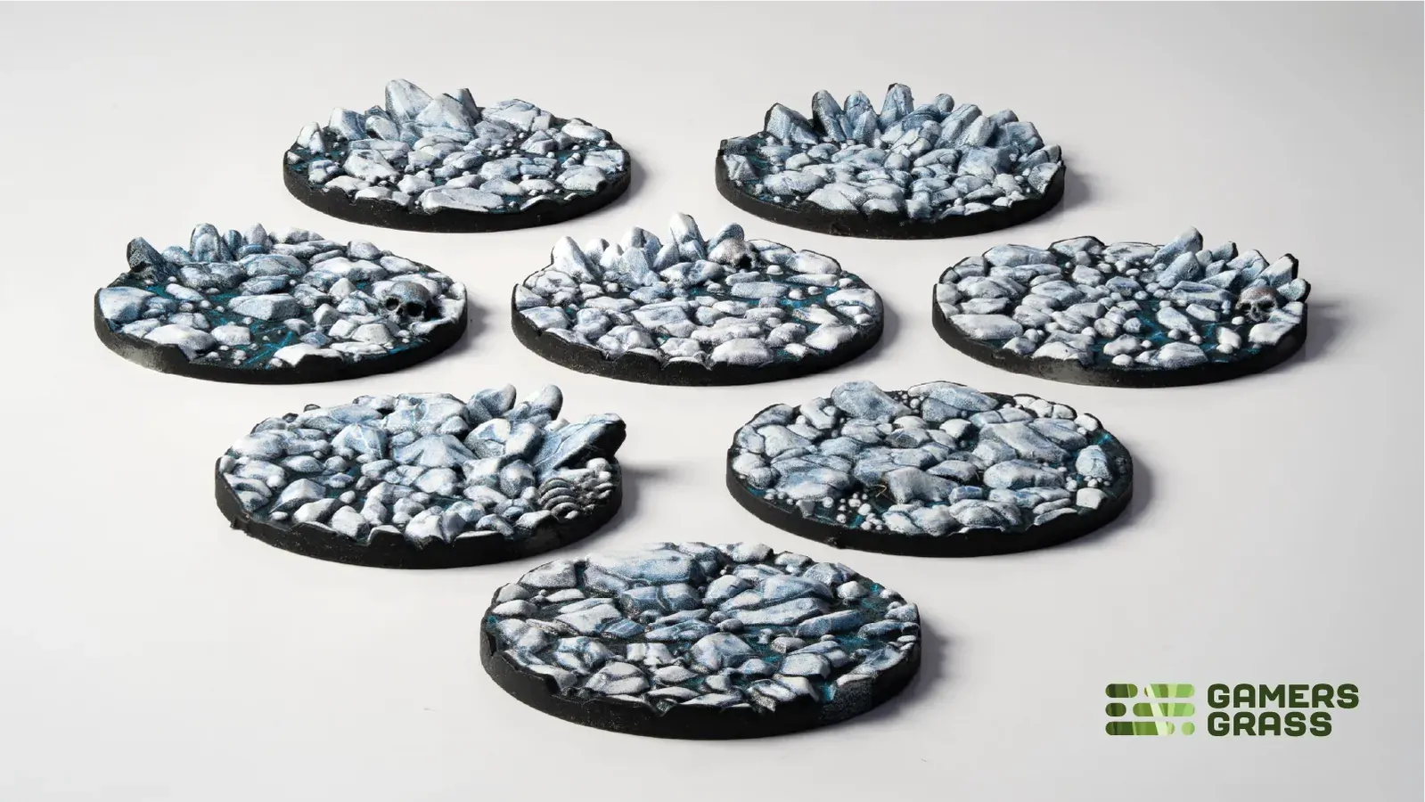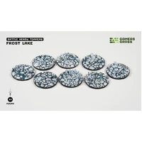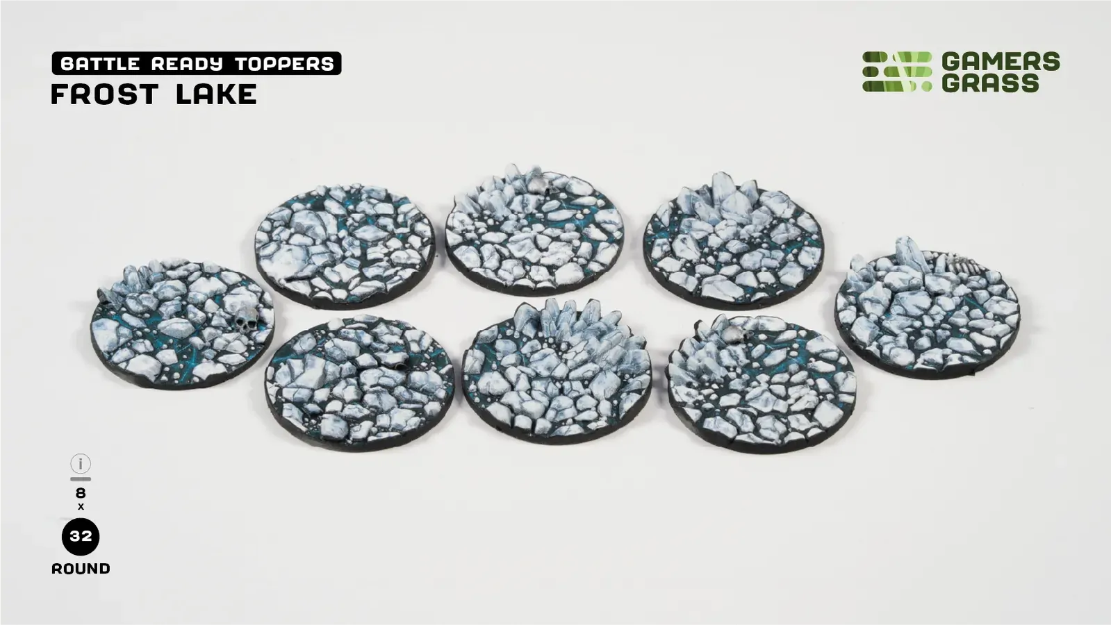 This blister contains 8 thermoplastic toppers made for 32mm round bases, in a Frost Lake theme.