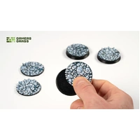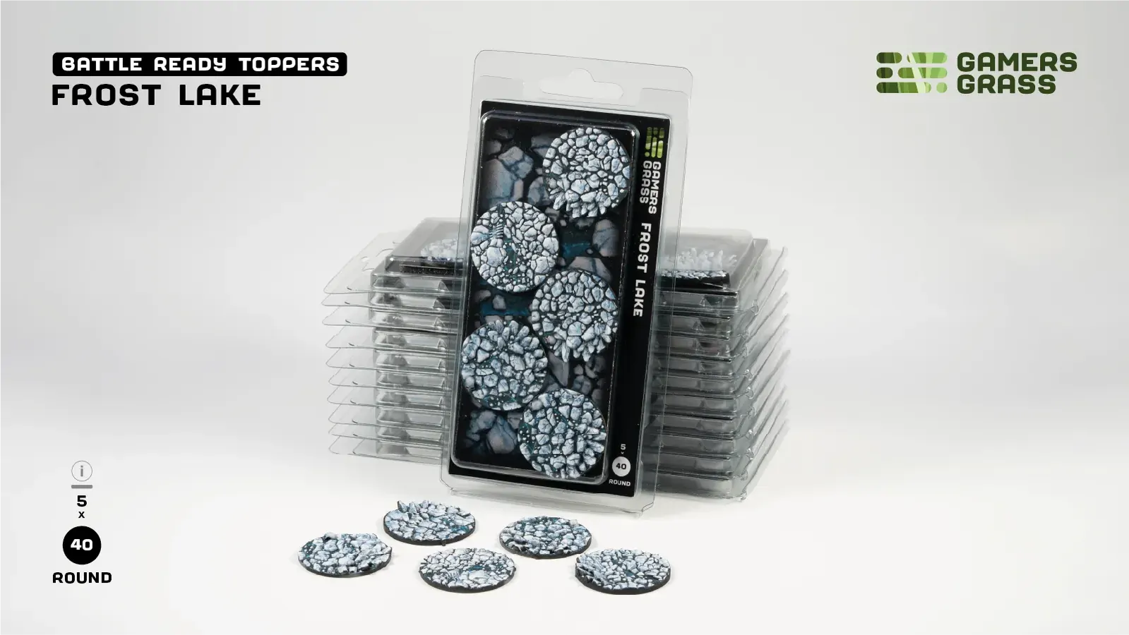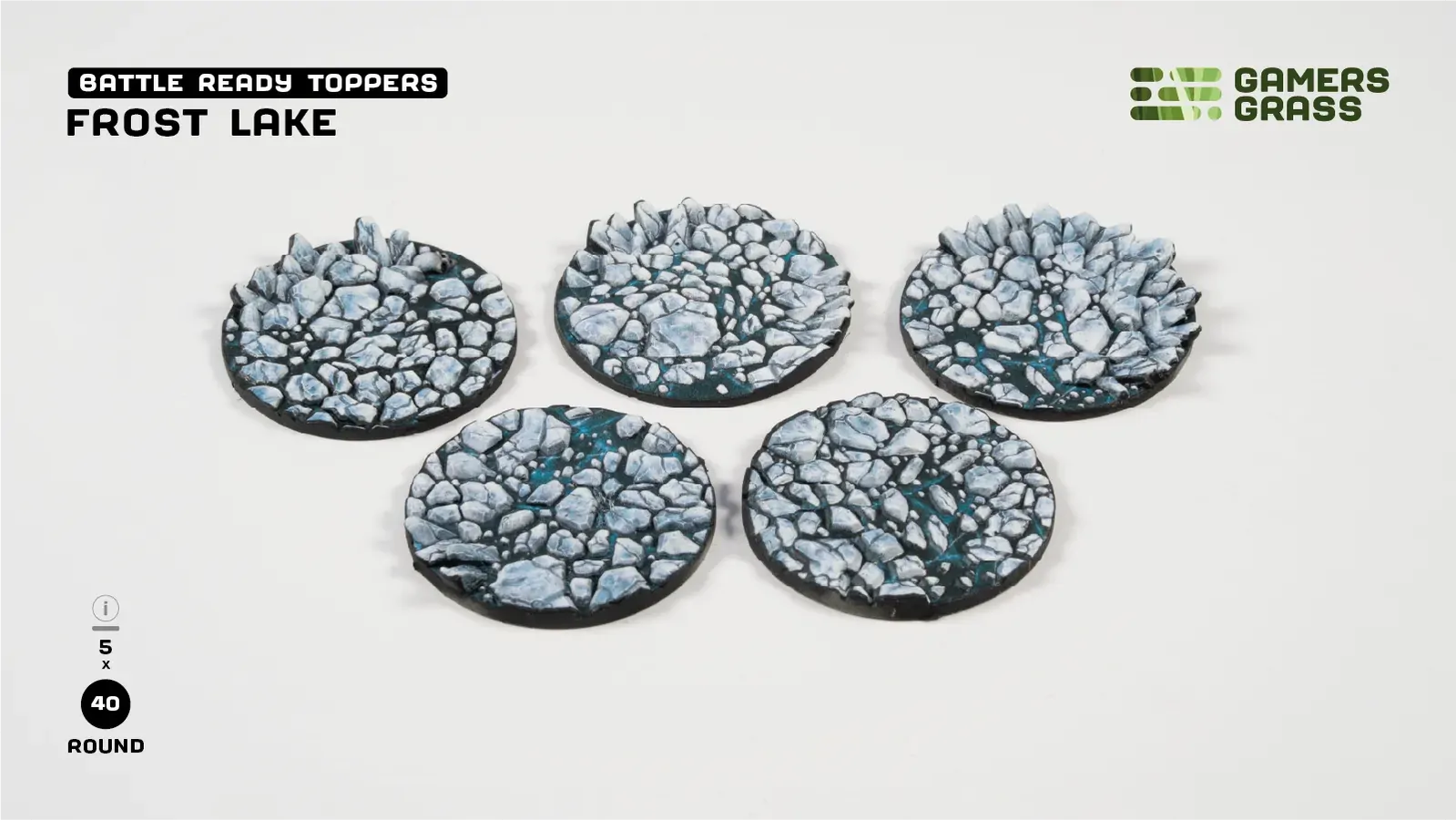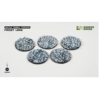 This blister contains 5 thermoplastic toppers made for 40mm round bases, in a Frost Lake theme.