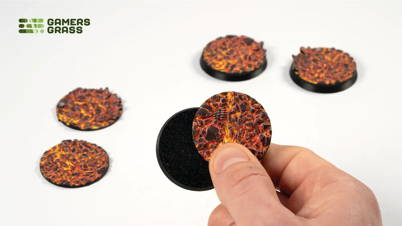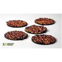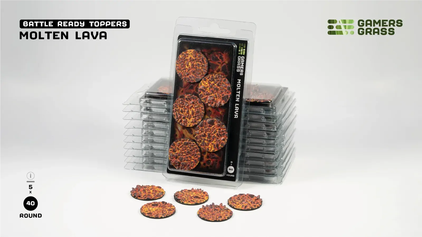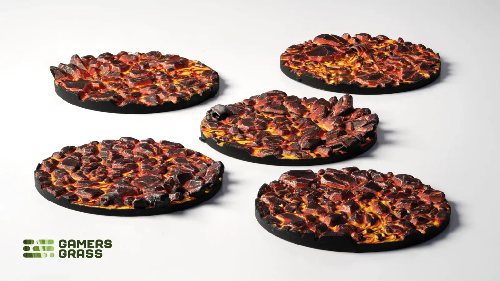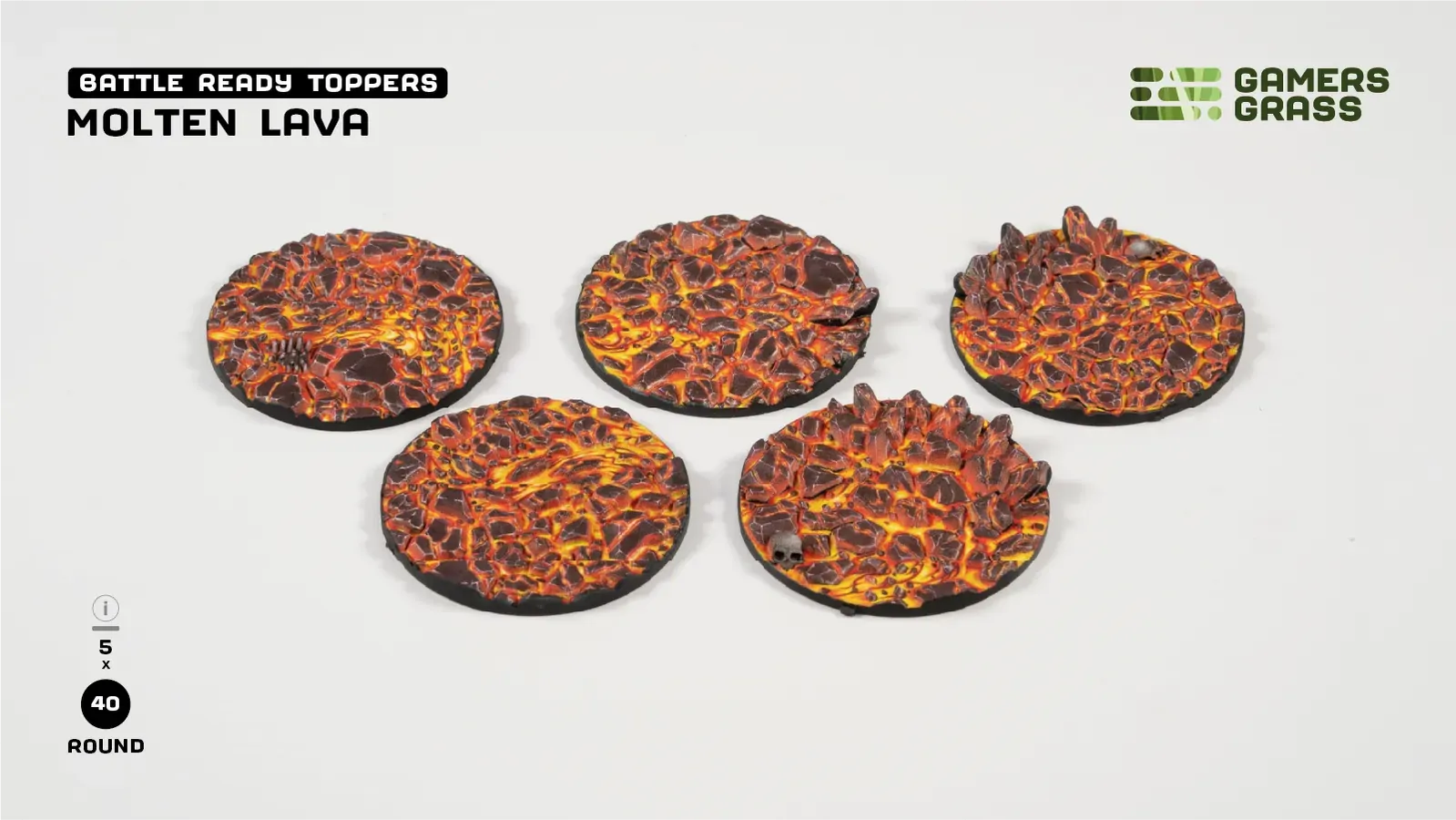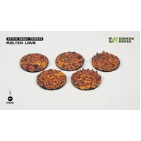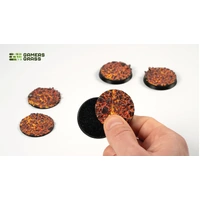 This blister contains 5 thermoplastic toppers made for 40mm round bases, in a Molten Lava theme.