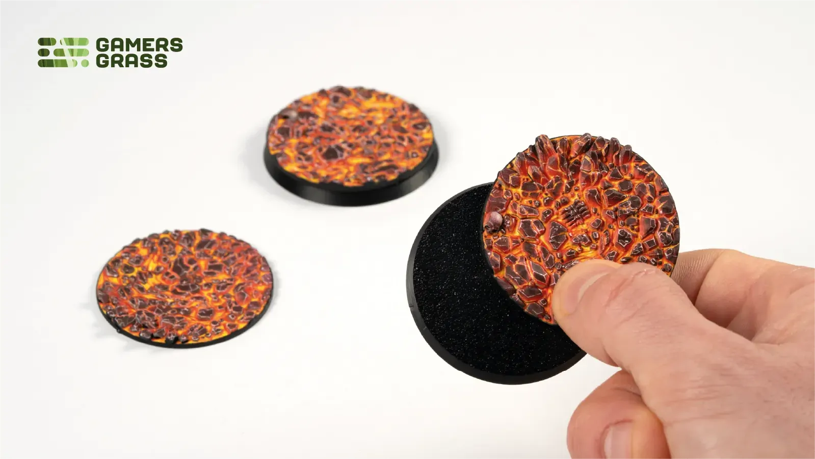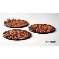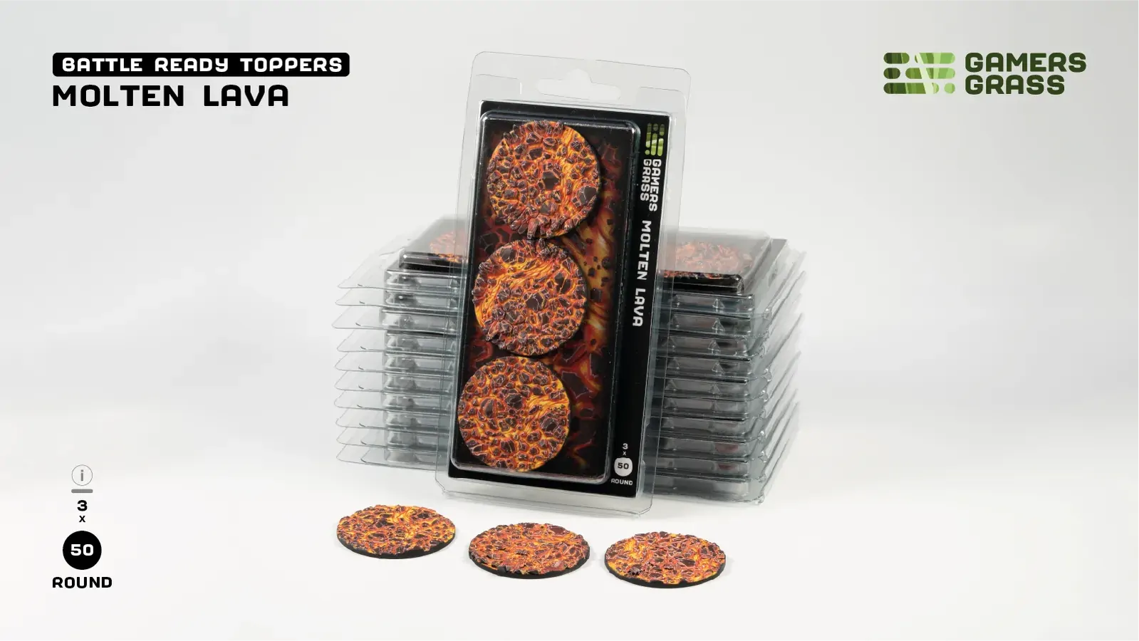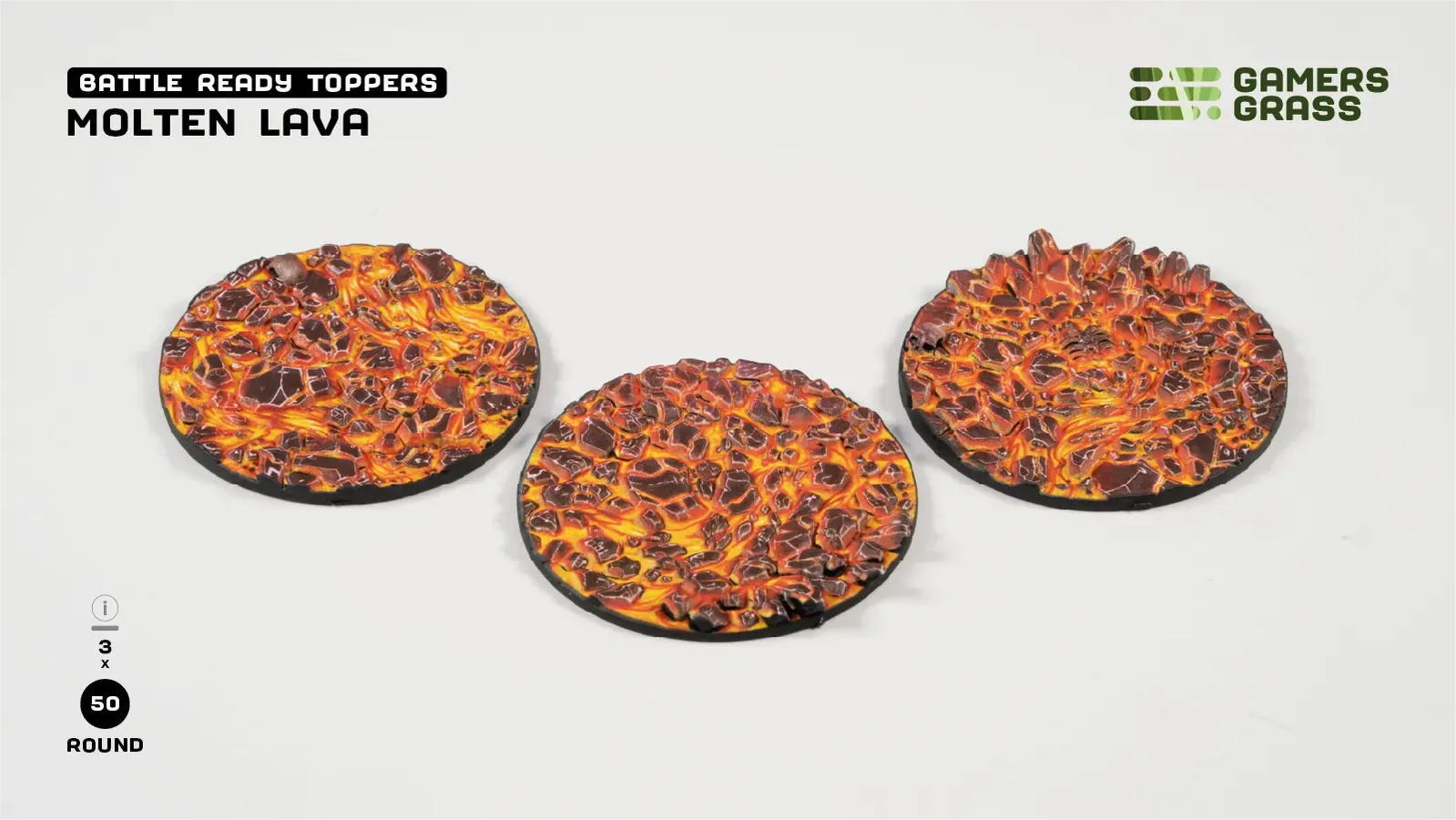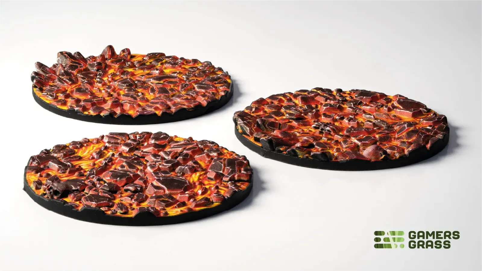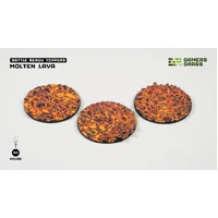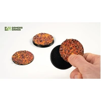 This blister contains 3 thermoplastic toppers made for 50mm round bases, in a Molten Lava theme.