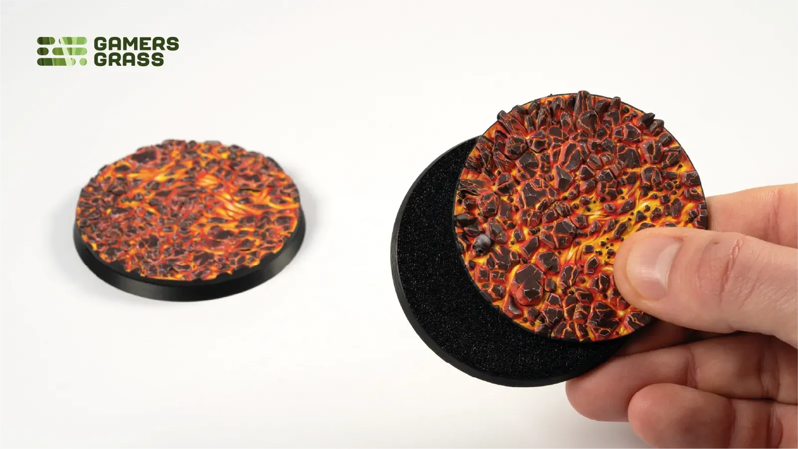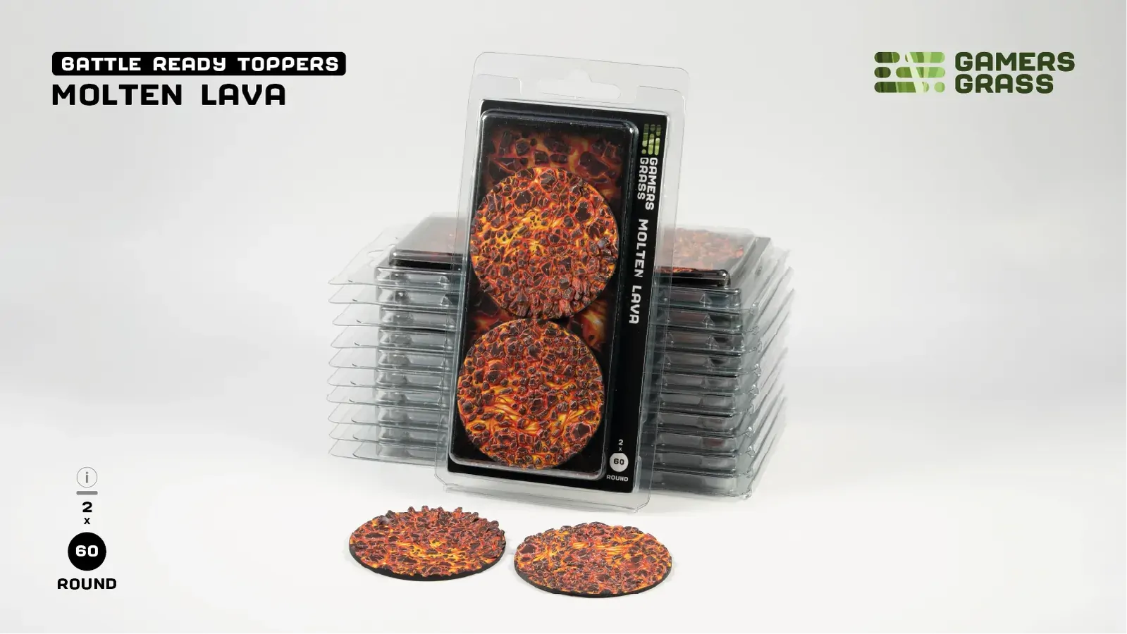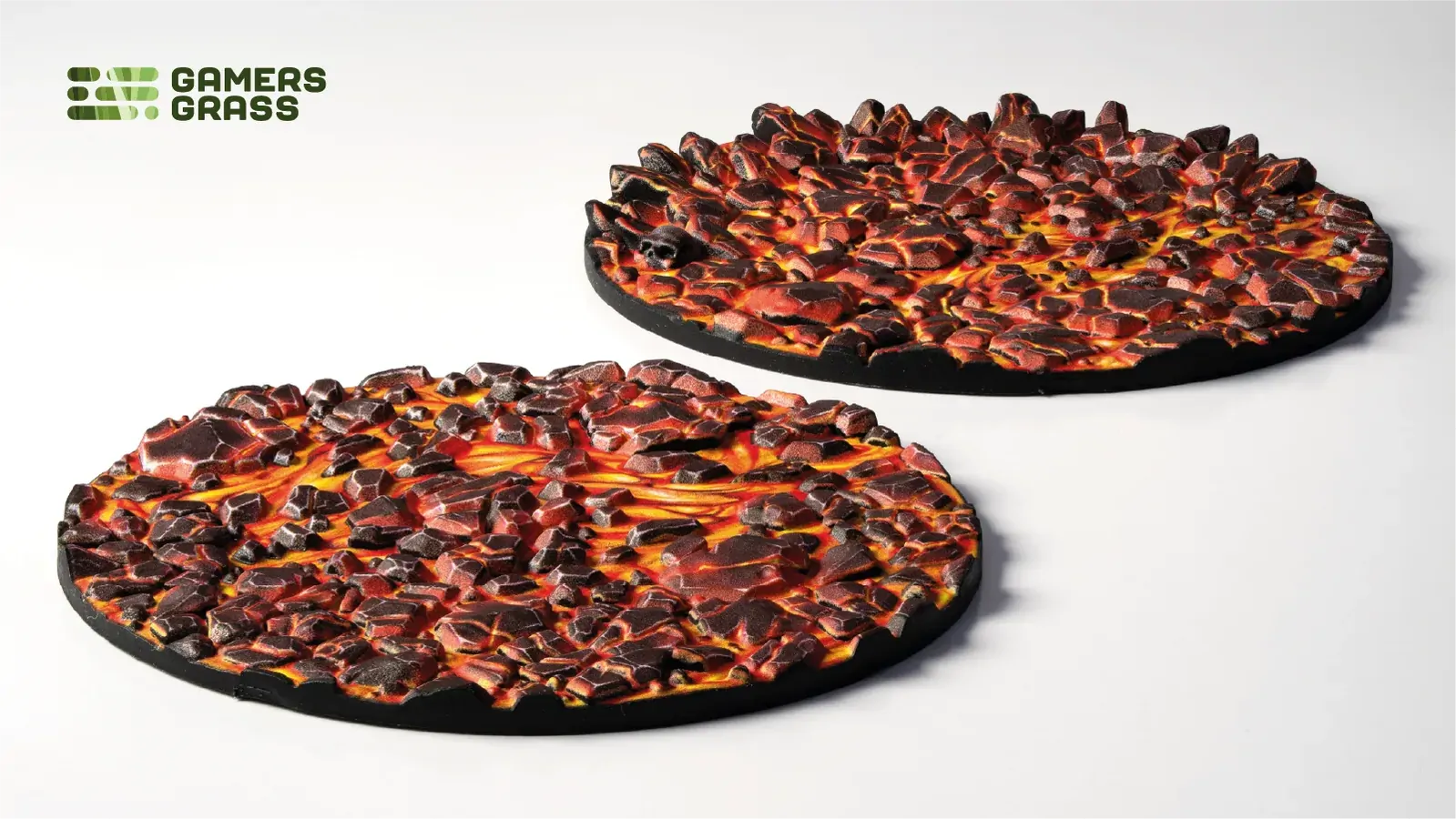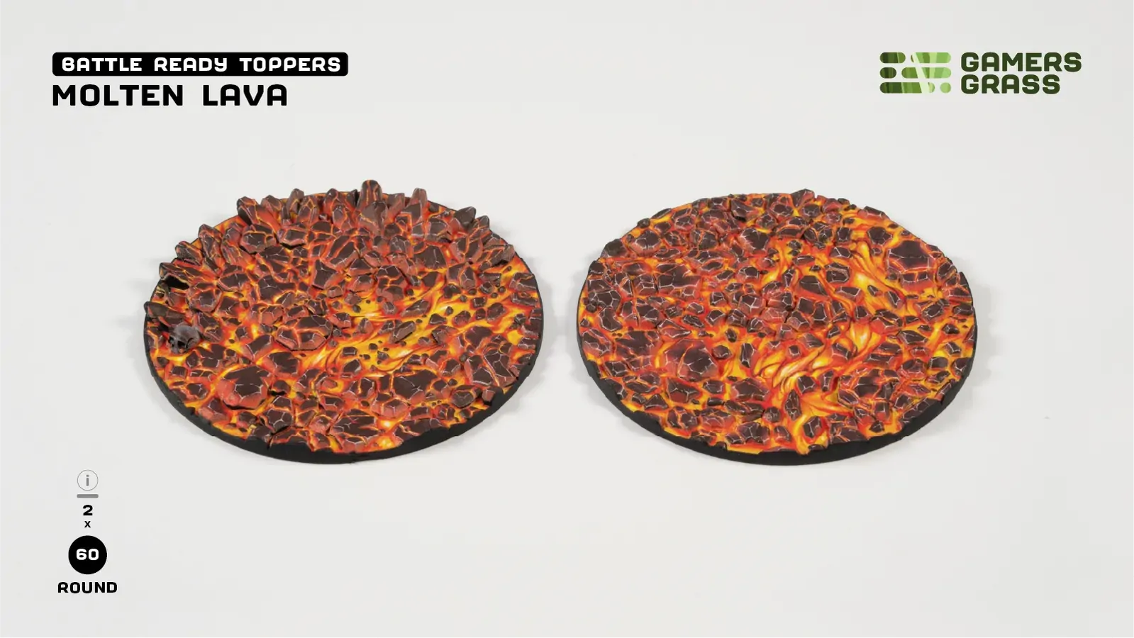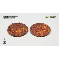This blister contains 2 thermoplastic toppers made for 60mm round bases, in a Molten Lava theme.