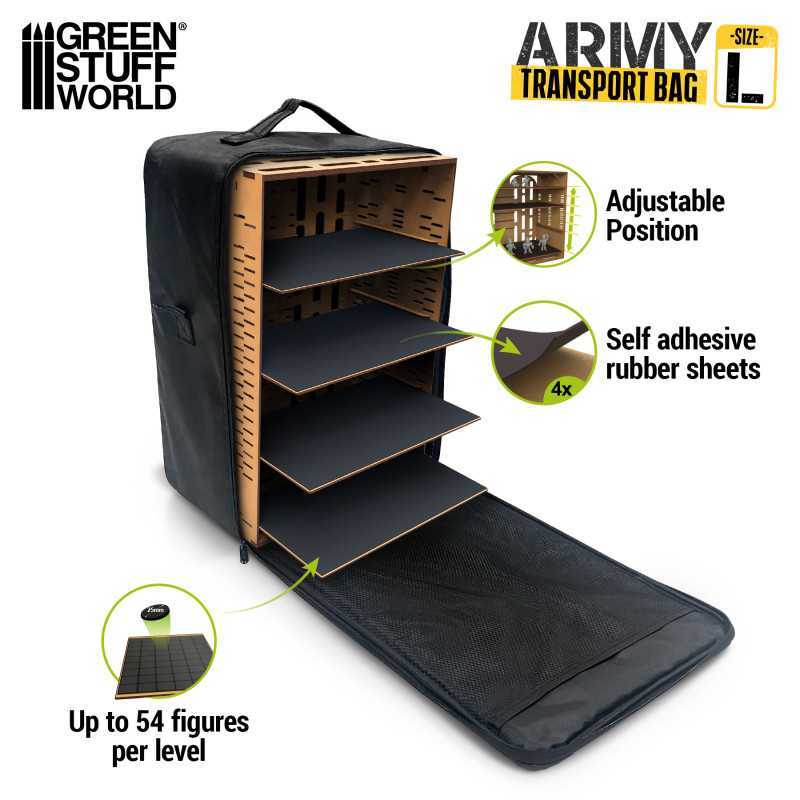 Army Transport Bag has been specifically designed to protect your armies while in transit. Made of lightweight, hard-wearing, and padded Oxford fabric for long-term durability will allow you to carry more than 200 miniatures sound and safe and distributed among its 4 levels.