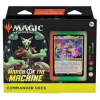 This March of the Machine Commander Deck set includes 1 ready-to-play deck of 100 Magic cards (2 Traditional Foil Legendary cards, 98 nonfoil cards), 10 specialty cards, a 2-card Collector Booster Sample Pack, 1 Foil-Etched Display Commander (a thick cardstock copy of the commander card with foil etched into the card’s border and art), 10 double-sided tokens, 1 deck box (can hold 100 sleeved cards), 1 Life Wheel, 1 special die, 1 strategy insert, and 1 reference card.