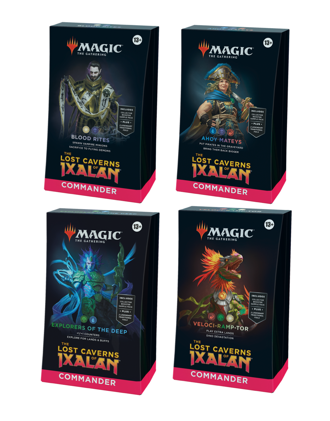 In Commander, four players come together to show their strength and strategy, with one player coming out on top. Each 100-card ready-to-play The Lost Caverns of Ixalan Commander Deck makes it easy for Commander fans in your store to grab a deck and play right away.