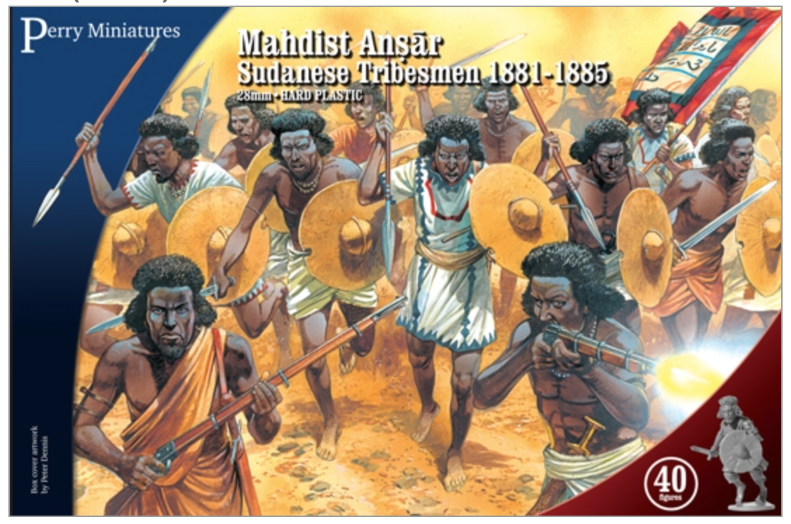 The box contains 40 28mm multipart hard plastic miniatures including command. These can be assembled to represent the Beja (Fuzzy Wuzzies)early or late war, Kordofan rebels or Nile Arabs that fought the British and Egyptian forces between 1881-85 during the Mahdist Uprising. There are two command sprues and three infantry on which are 40 Beja heads and 40 bare headed and capped ones as well. All arms are seperate with a mixture of spears, swords, throwing sticks and 8 rifles. The 36 shields are intended for the Beja. Also provided is historical background by the esteemed author Lt. Col. Mike Snook, 6 flags and sand coloured unit bases.
