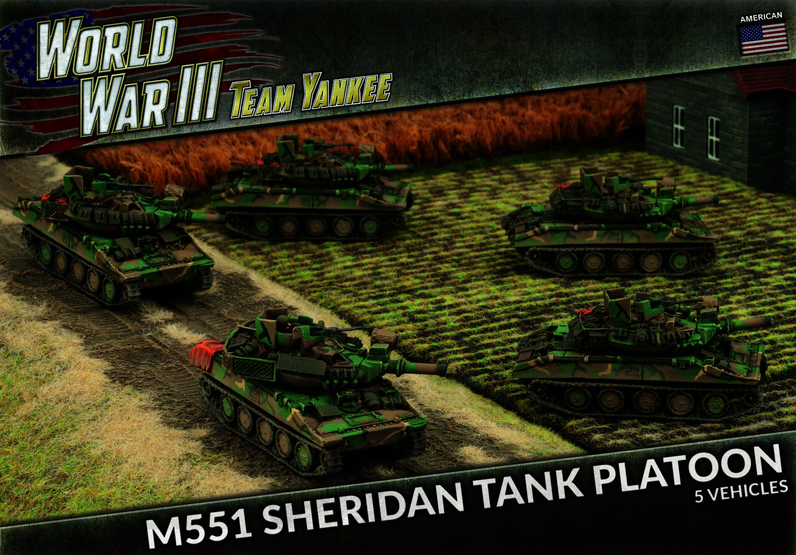 Contains five resin and metal M551 Sheridan Tanks and two unit cards
